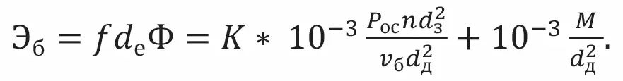 В представленных формулах левая часть (произведение f, dф Ф) находится на основании эмпирических данных изучения массивов скальных пород и называется показателем трудности бурения (Пб), а правая находится исключительно по техническим параметрам бурения скважин и называется энергоемкостью бурения (Эд). Первая компонента отражает непосредственно прочность разрушаемого массива, а вторая – суммарные затраты энергии через количественные показатели процесса бурения. и в теории между ними должно соблюдаться равенство, однако на практике такое равенство не всегда выполнимо из-за того, что не вся энергия, расходуемая установкой, идет непосредственно на разрушение горной породы. Часть ее уходит на преодоление сил трения внутри самого оборудования. Учесть каждый компонент механизма и оценить потери энергии в каждом его узле невозможно. В связи с этим для уравнивания системы применяется коэффициент K, который в целом отражает коэффициент полезного действия станка (КПД).